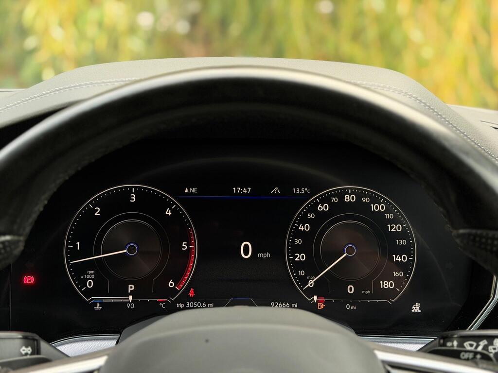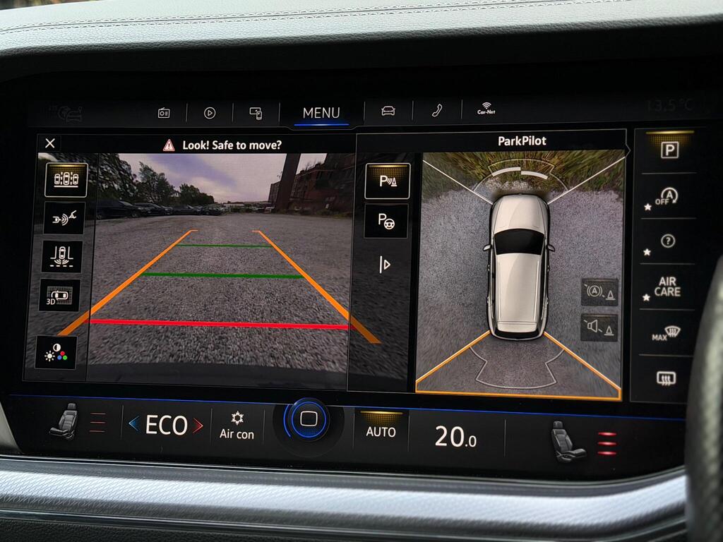 Comfort and technology are key strengths, with 4-zone climate control, heated electric memory seats, satellite navigation, Bluetooth connectivity, and a comprehensive parking assistance system including reversing camera and ultrasonic sensors. Safety and driving ease are enhanced by Adaptive Cruise Control with Front Assist, while the 360-degree Area View system makes manoeuvring effortless.